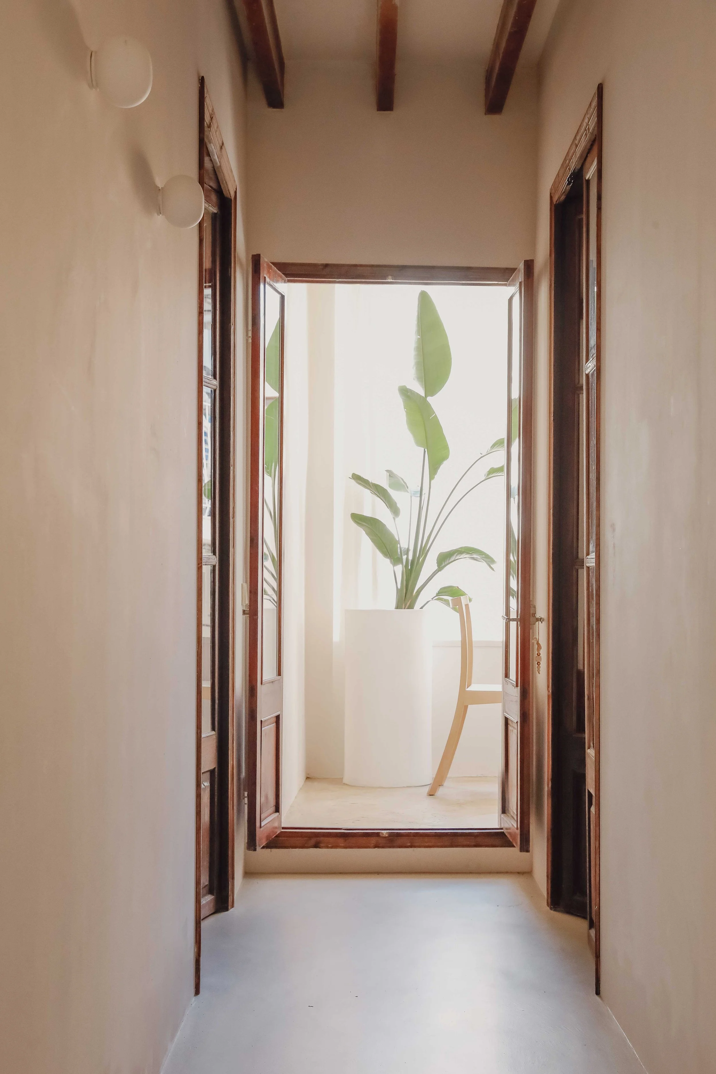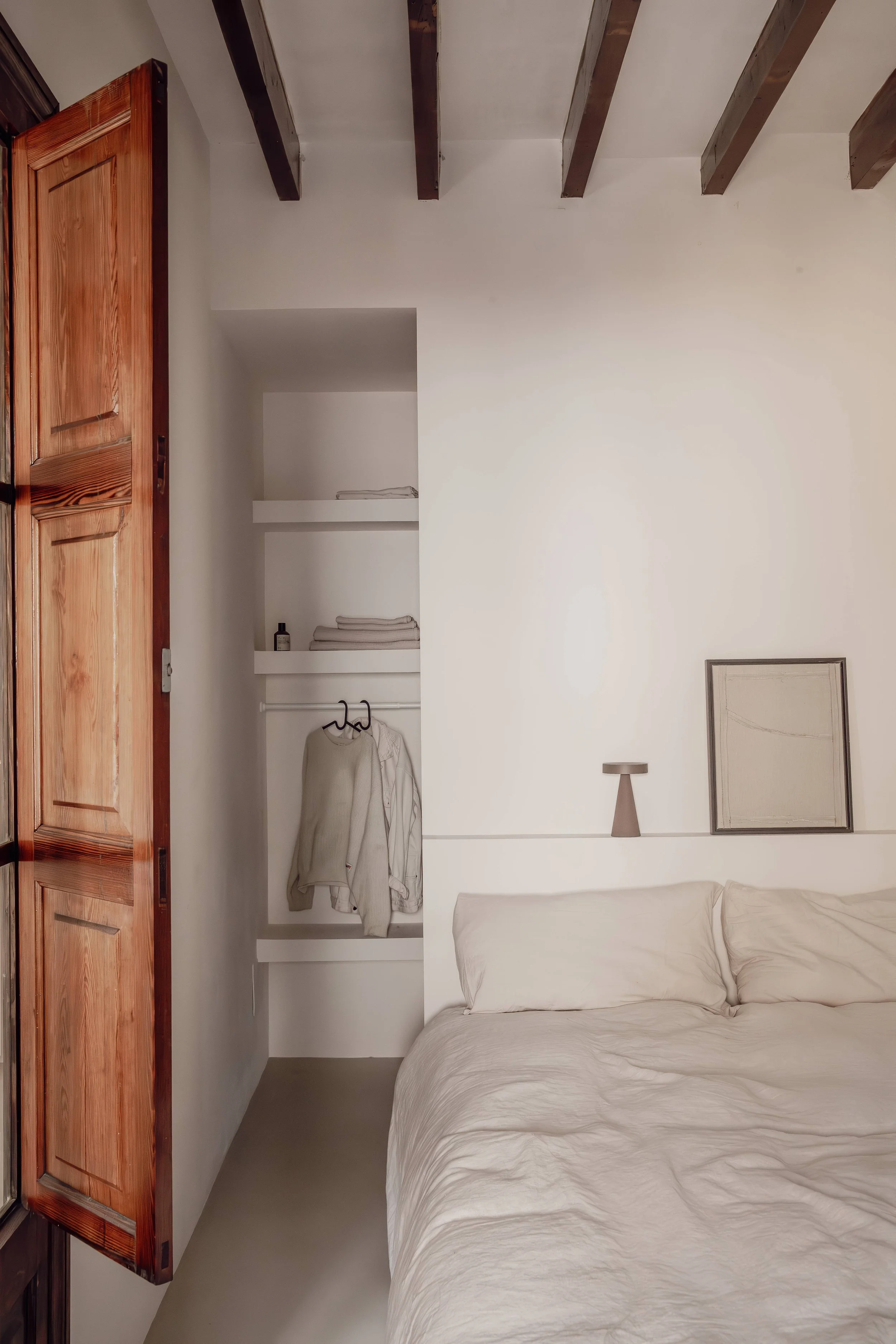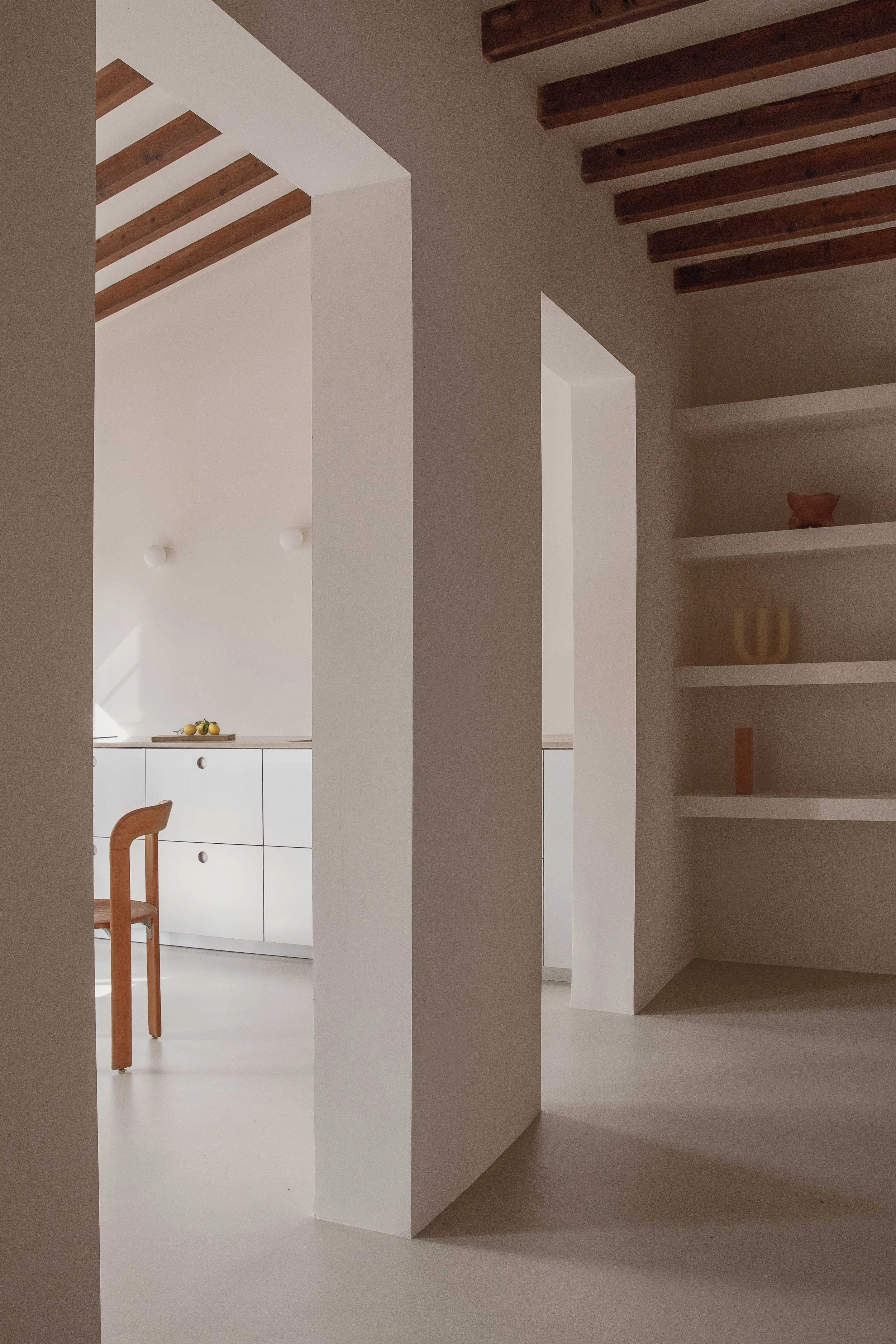 Located in a highly desirable central position within Santa Catalina, this Apartment presents a refined Mediterranean living environment defined by clear architectural structure, spacious layouts and a deliberately subtle selection of materials. The residence unfolds into an expansive open-plan living, dining and kitchen area, characterised by ceiling heights reaching approximately 3.7 metres and preserved exposed timber beams that introduce texture and warmth to the otherwise pared-back aesthetic. Natural light glides gently across the continuous microcement flooring, reinforcing a feeling of tranquillity and spatial flow.
