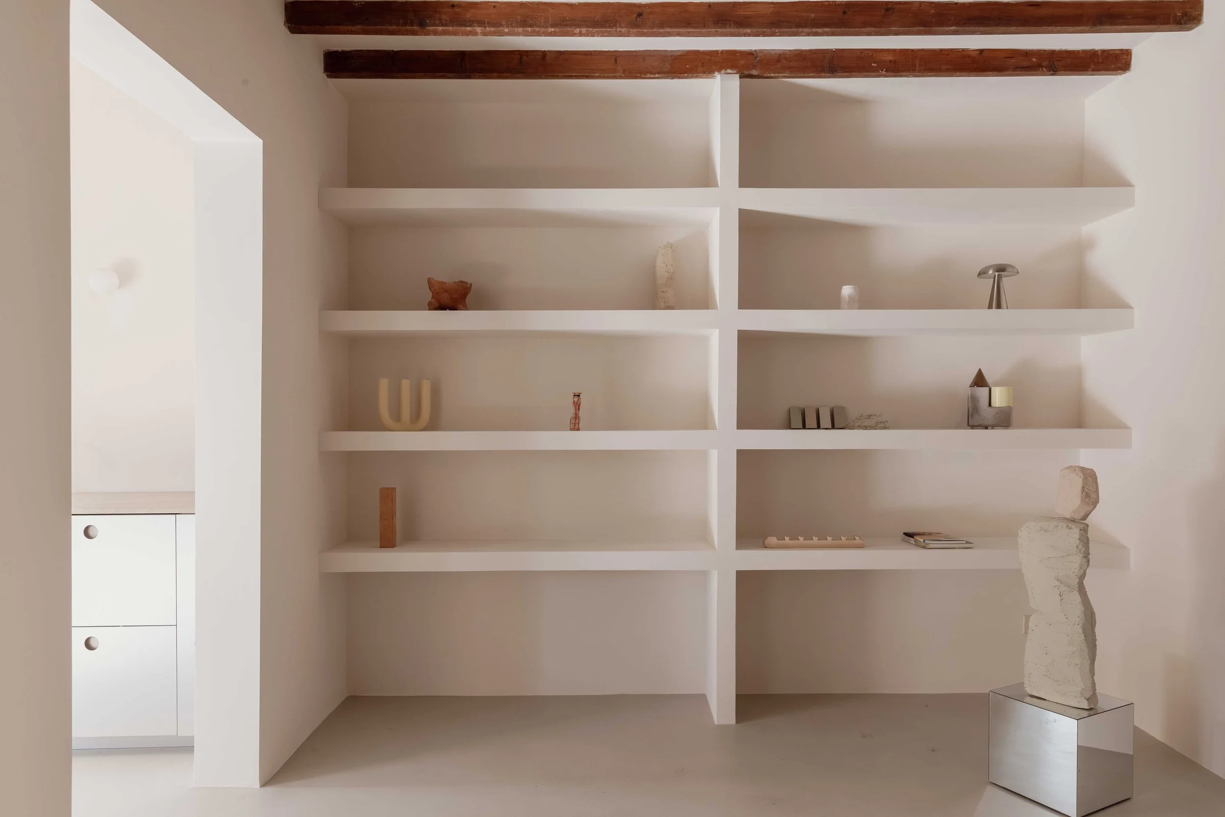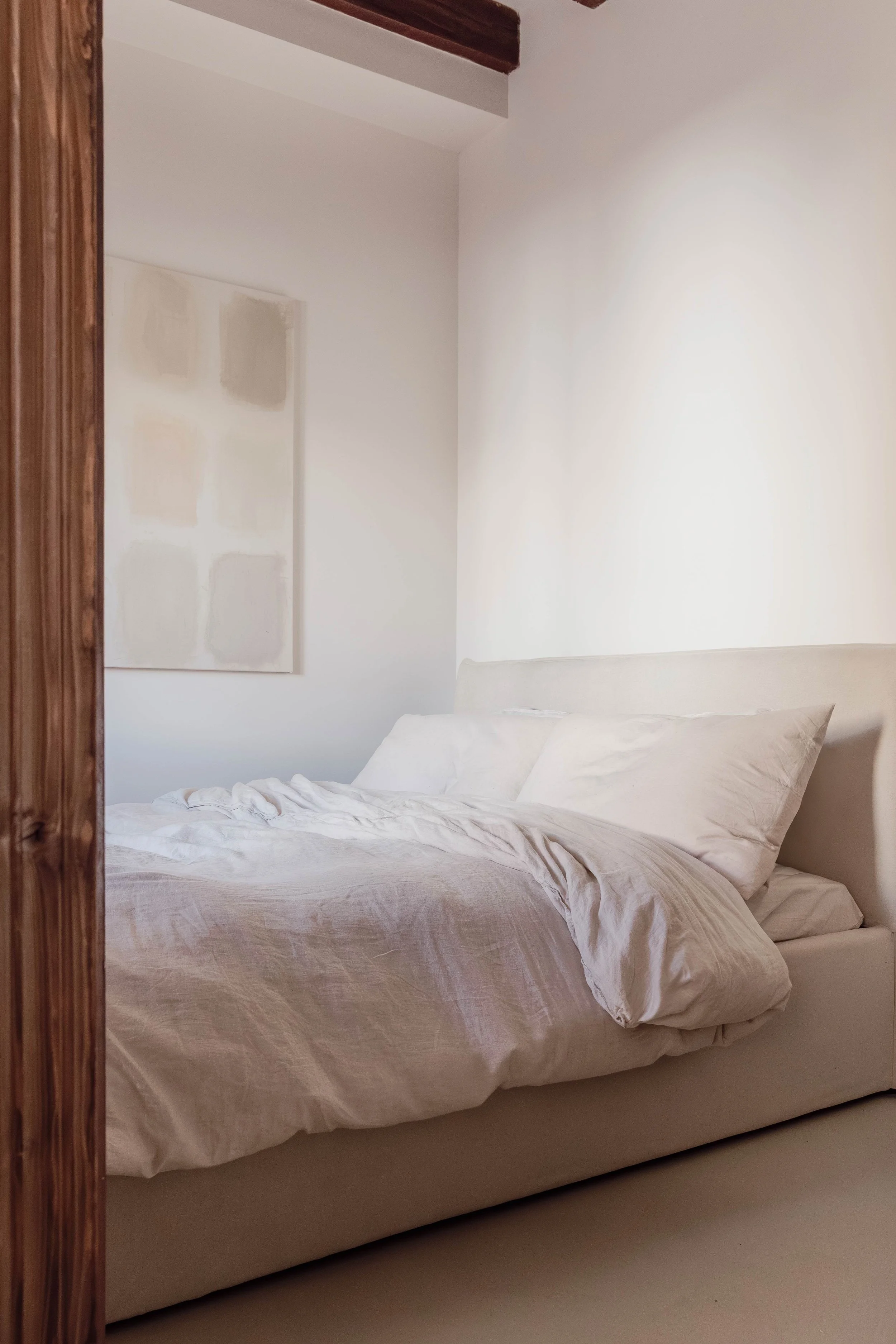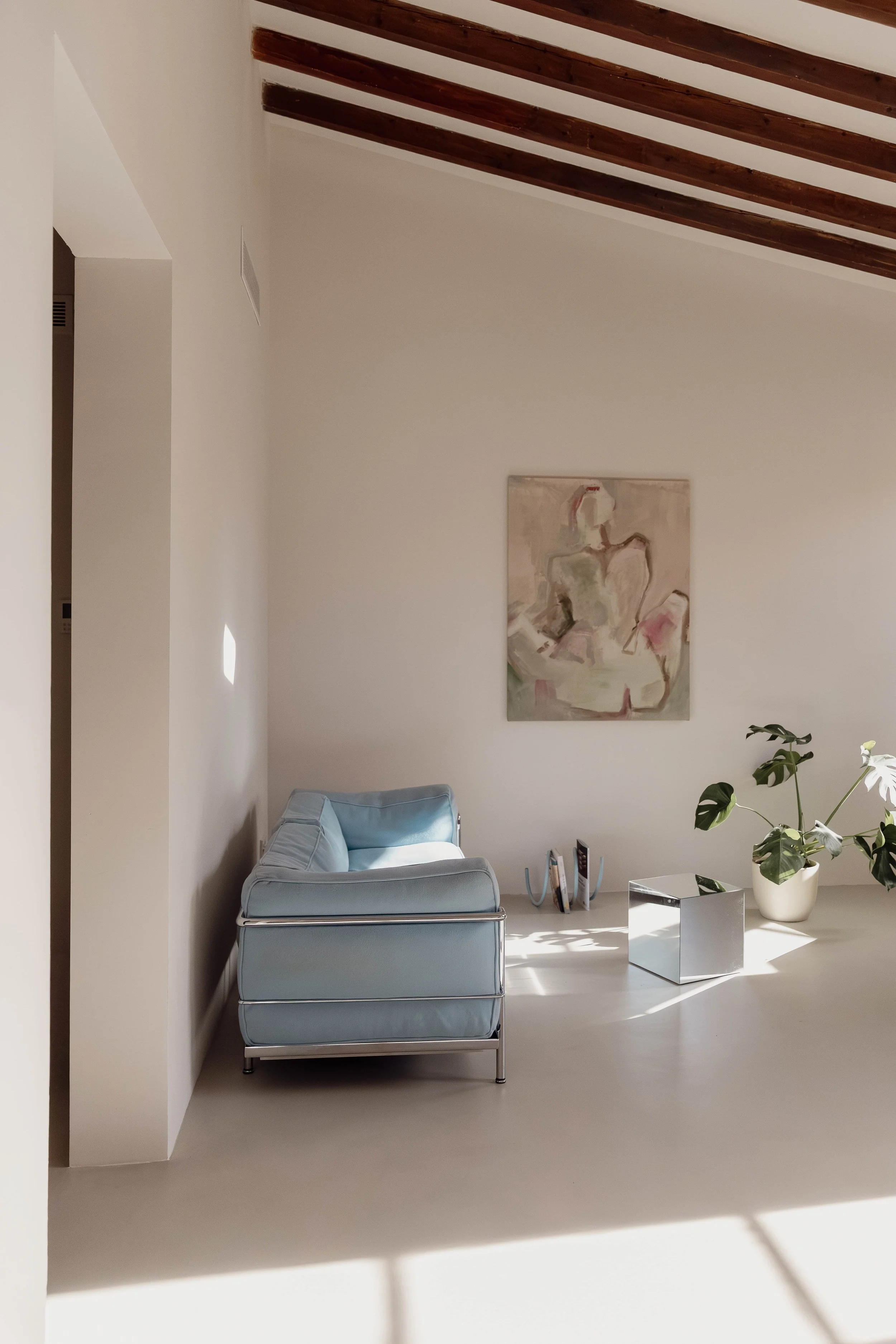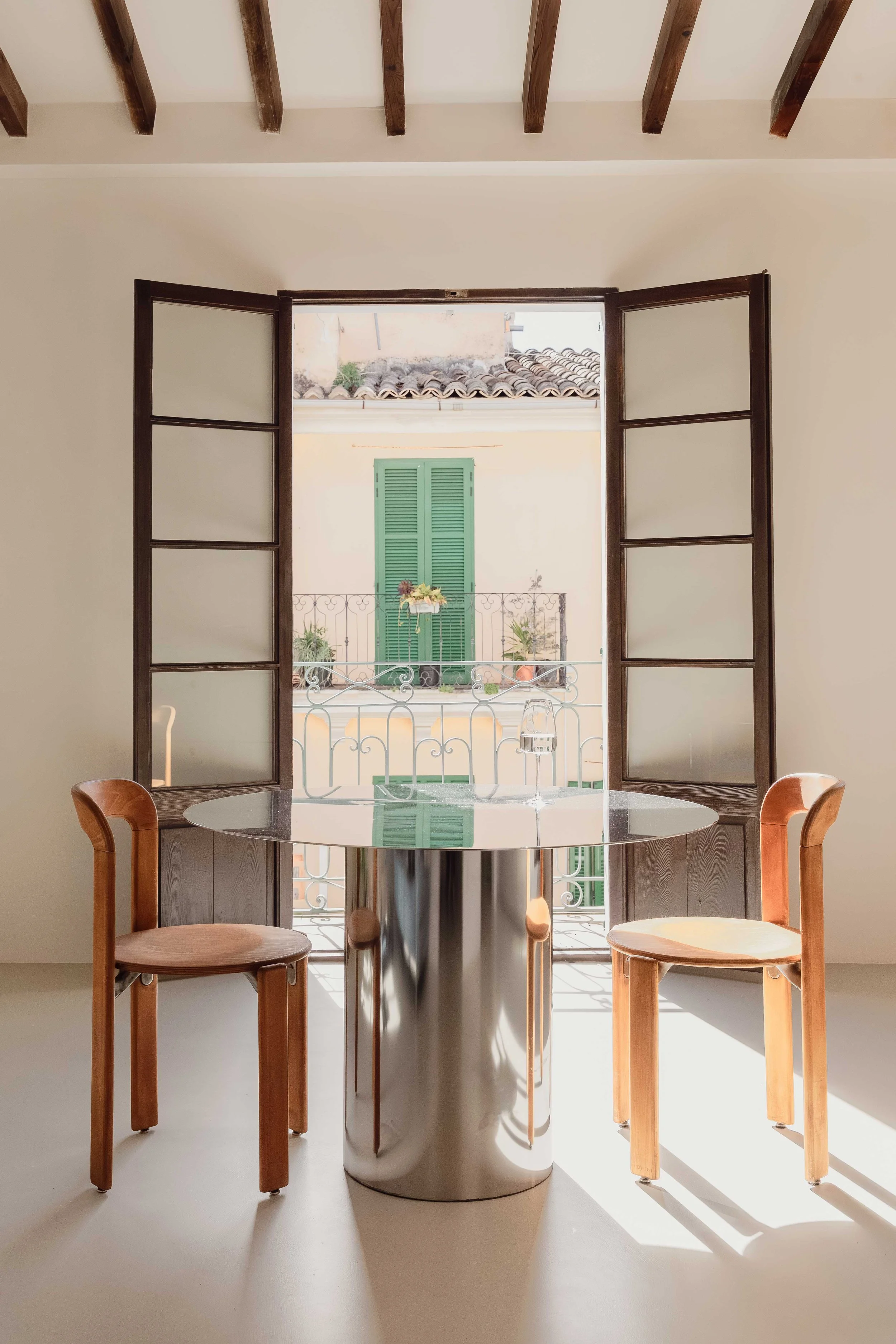 Located in a highly desirable central position within Santa Catalina, this Apartment presents a refined Mediterranean living environment defined by clear architectural structure, spacious layouts and a deliberately subtle selection of materials. The residence unfolds into an expansive open-plan living, dining and kitchen area, characterised by ceiling heights reaching approximately 3.7 metres and preserved exposed timber beams that introduce texture and warmth to the otherwise pared-back aesthetic. Natural light glides gently across the continuous microcement flooring, reinforcing a feeling of tranquillity and spatial flow.